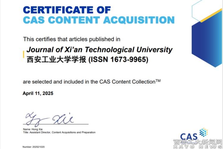 (本網訊)近日,《西安工業大學學報》通過前期申報,經美國化學文摘社(Chemical Abstracts Service,CAS)專家評估委員會嚴格評估后,最終被全球權威數據庫美國化學文摘社數據庫(CAS)正式收錄。此次收錄將進一步提升《西安工業大學學報》的期刊國際影響力和傳播力。