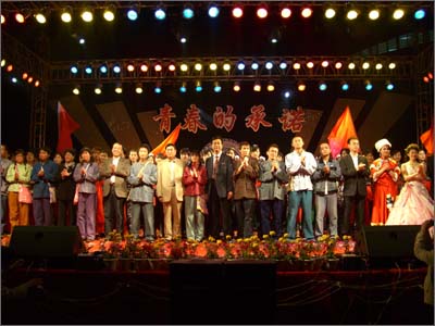 晚會的最后,全場齊唱主題曲《奮進之路》。嘹亮的歌聲響徹整個廣場、整個校園,在熱烈的氣氛中,校領導走上舞臺,與參加演出的同學們親切握手,祝賀大家演出成功,與大家合影留念。