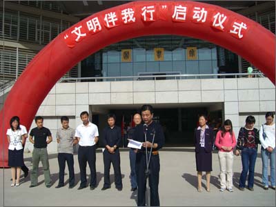 五月四日,在這個(gè)青年的節(jié)日里,我們迎來(lái)我校“文明伴我行”啟動(dòng)。下午16:30校團(tuán)委副書(shū)記趙瓊宣布“文明伴我行”啟動(dòng)儀式正式開(kāi)始。在一片熱烈的掌聲中,校黨委副書(shū)記丁養(yǎng)斌作了重要講話(huà),在講話(huà)中丁副書(shū)記首先闡明了“五.四” 這個(gè)特殊日子的意義;其次對(duì)我校正在接受教育部評(píng)估時(shí)由校團(tuán)委學(xué)生會(huì)主辦的“文明伴我行”活動(dòng)給予了充分肯定;最后對(duì)文明使者提出了一些具體的要求和希望。學(xué)生處處長(zhǎng)任慧英宣讀了第一批文明使者名單,之后由丁副書(shū)記等領(lǐng)導(dǎo)給28位文明使者授旗、戴牌。最后,文明使者代表宣讀了文明伴我行的倡議書(shū)。整個(gè)大會(huì)在熱烈的氛圍中結(jié)束。