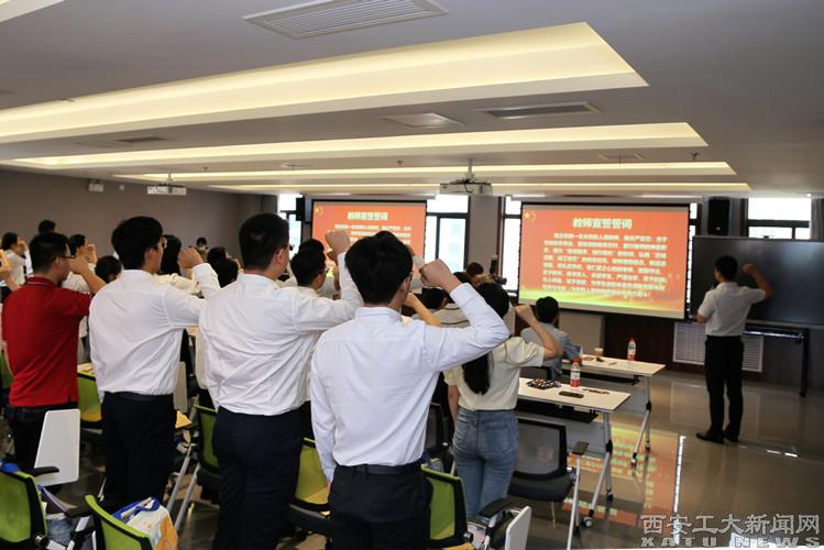 全體參會教師在優(yōu)秀教師代表、全國高校教師教學創(chuàng)新大賽二等獎獲得者白崗老師的帶領下,進行莊嚴宣誓。擲地有聲的誓詞,緊握高舉的右拳,是每一位新教師的前進方向,更是對教育事業(yè)的莊嚴承諾。