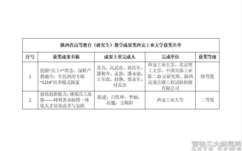 (本網訊)近日,陜西省人民政府辦公廳發布《關于表彰2023年高等教育教學成果獎獲獎項目的通報》(陜政辦函〔2024〕104號),本次評獎首次單獨設立高等教育(研究生)類別,我校榮獲陜西省2023年高等教育(研究生)教學成果獎2項,其中特等獎1項、二等獎1項。