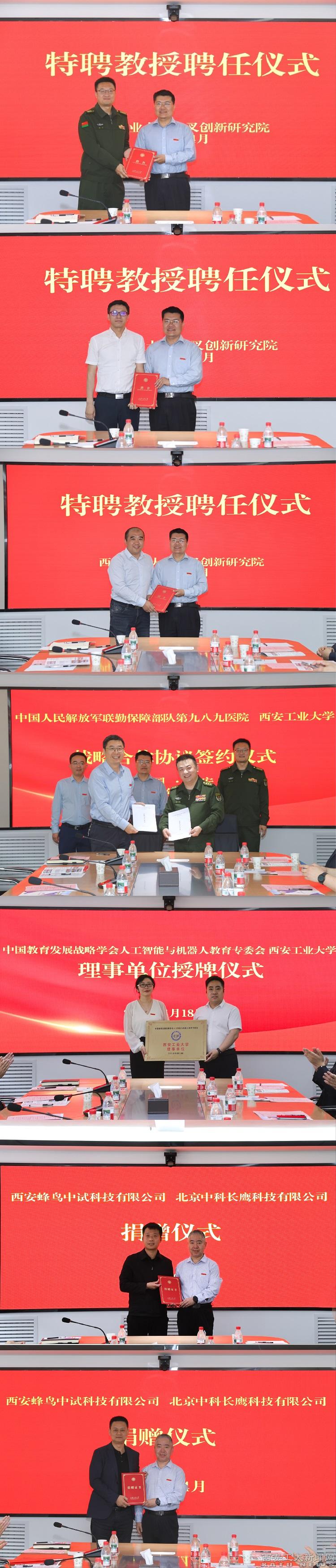 論壇前進(jìn)行了兼職、特聘教授聘任儀式,中國(guó)人民解放軍聯(lián)勤保障部隊(duì)第九八九醫(yī)院與西安工業(yè)大學(xué)簽約儀式,中國(guó)教育發(fā)展戰(zhàn)略學(xué)會(huì)人工智能與機(jī)器人教育專委會(huì)對(duì)交叉創(chuàng)新研究院理事單位授牌儀式和愛心企業(yè)捐贈(zèng)儀式。