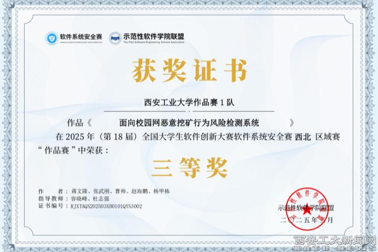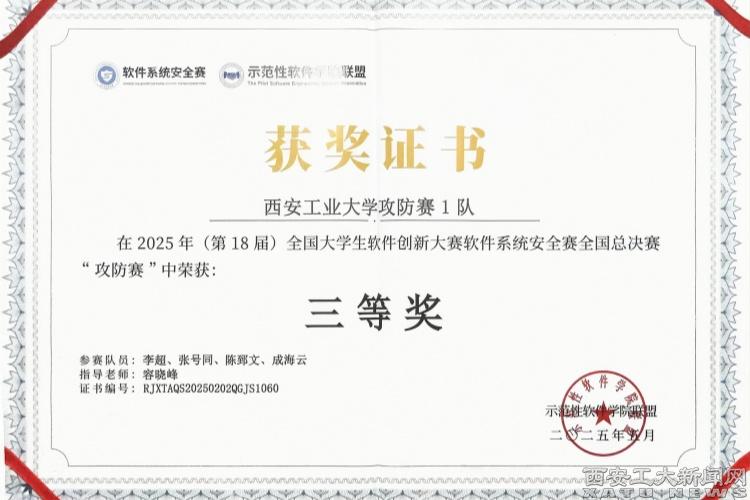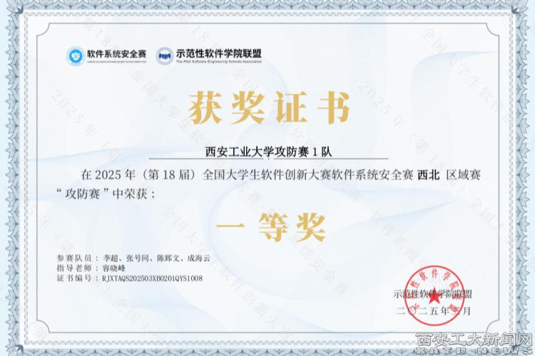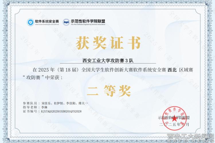 本年度賽事,吸引了全國406所高校1780支隊伍報名參賽。在西北區域賽中,我校學子李超、張號同、陳郅文、成海云組成的西安工業大學攻防賽1隊取得西北區域賽“攻防賽”一等獎;宋佳樂、杜伊恒、傅天一、李佳陽組成的西安工業大學攻防賽3隊取得西北區域賽“攻防賽”二等獎;“蔣文隆、張武剛、曹帥、趙海鵬、楊甲棟”組成的西安工業大學作品賽1隊取得西北區域賽“作品賽”三等獎。