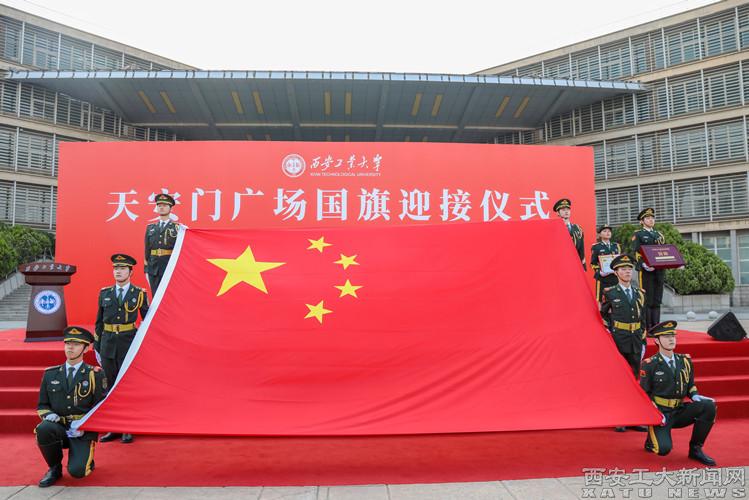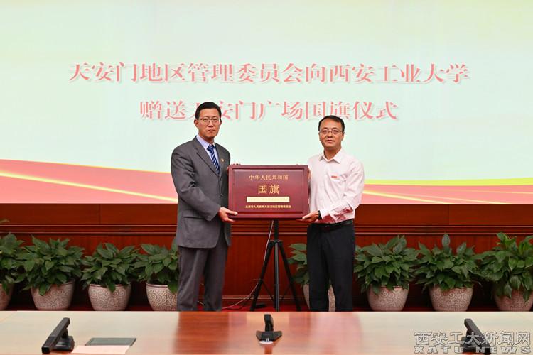 5月23日下午,贈送天安門廣場國旗儀式在北京市人民政府天安門地區(qū)管理委員會舉行,天安門地區(qū)管理委員會黨組成員、副主任(正局長級)姚輝向學校贈送國旗,校黨委副書記馬福代表學校迎請國旗,雙方簽訂《國旗贈予協(xié)議》。我校獲贈國旗編號為“2006-0148”,旗長5米、高3.3米,于2006年4月21日在天安門廣場升掛,當天是我校更名為西安工業(yè)大學暨建校51周年紀念日。