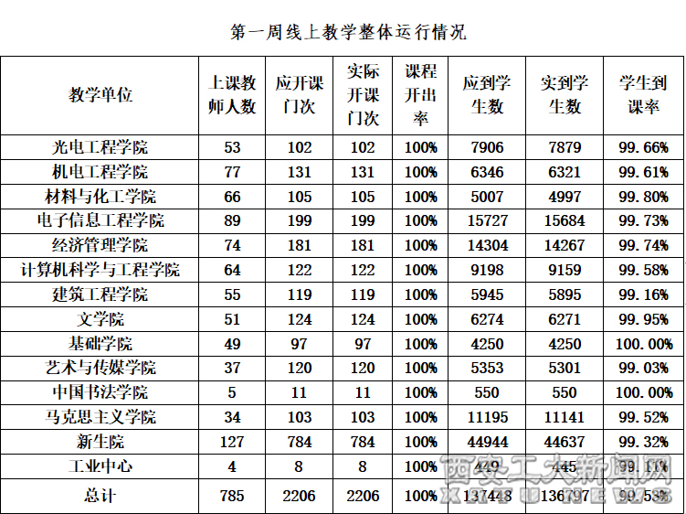 第一周線上教學穩步推進,上課教師785人,應開課2206門次,實際開課2206門次,課程開出率100%,應上課學生數137448人次,實到學生數人次136797,學生到課率99.53%。在全校師生共同的努力下,我校第一周線上教學工作整體平穩有序,教師注重教學質量,總體情況良好。
