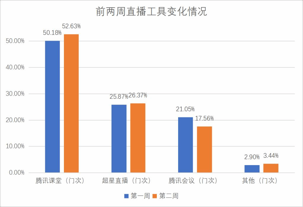 通過前期的問題反饋,教師對線上教學工具進行了優化,從本周教師線上直播教學工具的使用情況來看,騰訊課堂和超星直播有所增加,騰訊會議有所減少,具體情況如下: