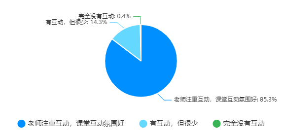 通過對學生調查反饋來看,學生對教師線上教學中師生互動認可度較高,認為老師注重互動、課堂互動氛圍好,占比85.3%;有互動、但很少,占比14.3%;完全沒有互動,占比0.4%。