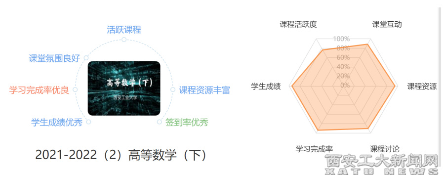 新生院王艷紅老師的《高等數學》課程就展現了這樣一幅全新的課程畫像。線上教學平臺的“課程畫像”顯示,王老師這門課程屬于“活躍課程”,“課程資源豐富”“簽到率優秀”“課堂氛圍良好”“學習完成率優良”“學生成績優秀”。