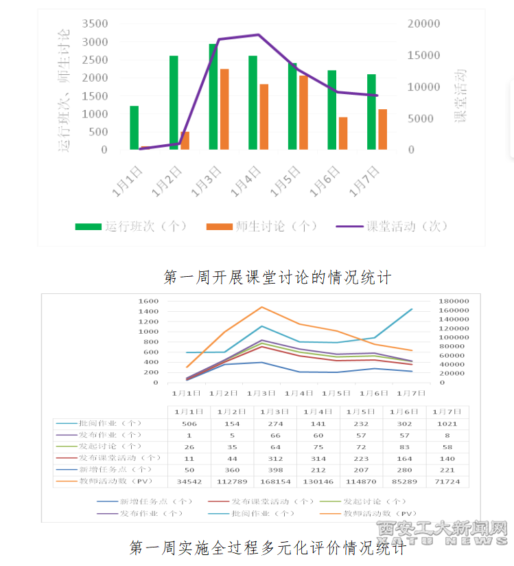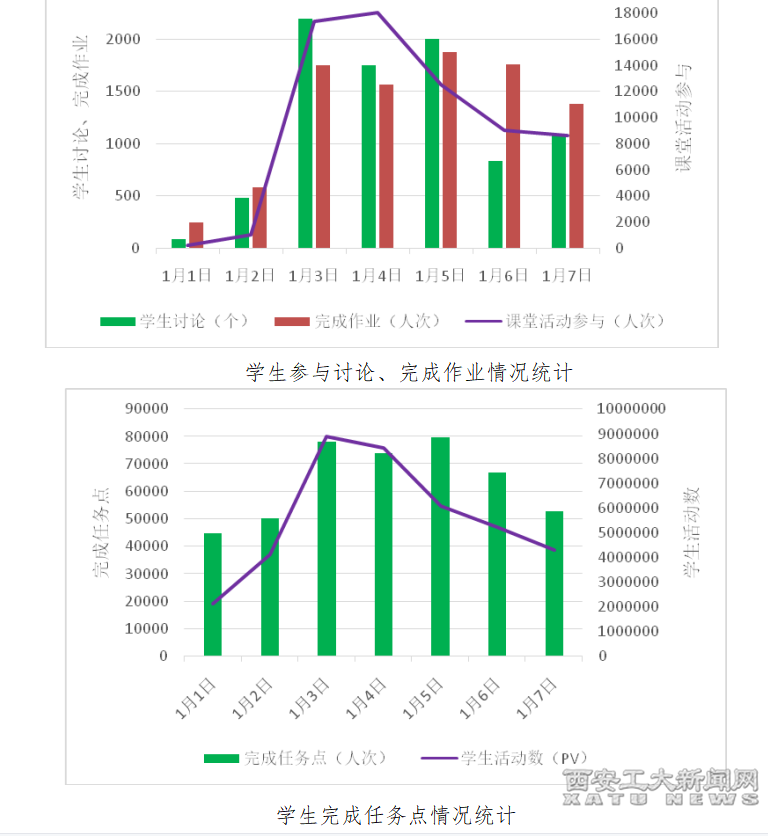 教學平臺統計顯示,更多的任課教師能利用線上平臺開展實施多元化評價,或布置形式多樣的作業,通過全過程考核學生對知識的掌握和運用,而更多的同學也在老師的引導下開展自主學習,完成教學任務。1月1日-7日,泛在平臺教師活動數45588pv,新增任務點1728個,發布課堂活動1885個,發起討論413個,發布作業254個,批閱作業2630個。