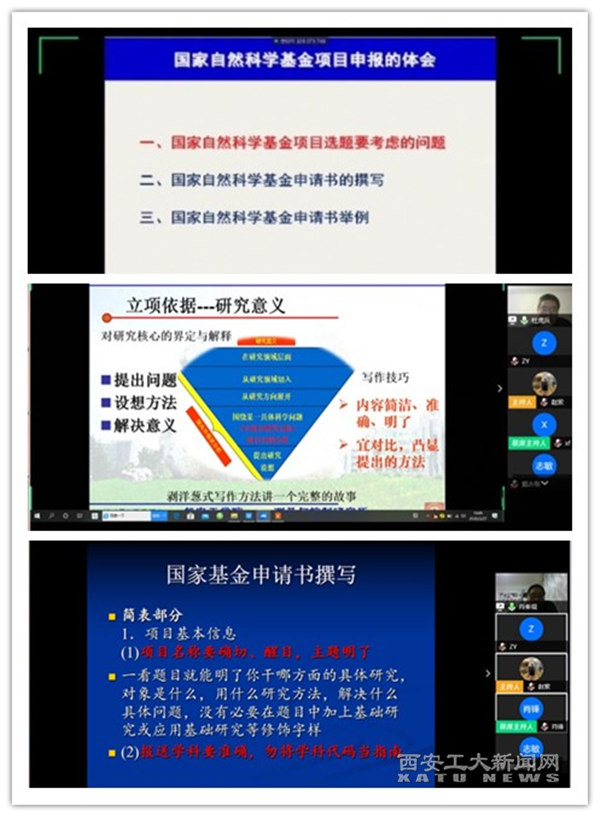 三位主講人分別介紹了各自對于國家自然基金的理解,撰寫心得體會以及方法技巧,同時結合本人獲批的項目申報書,詳細闡述了基金撰寫的寫作方式、邏輯關系以及重點、要點。專家們還與參加培訓的各位老師進行了在線交流,耐心解答了老師們在寫作過程當中遇到的各種問題和困惑。