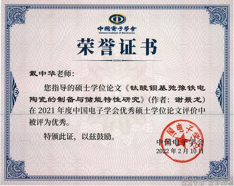 (本網訊)近日,中國電子學會優博論壇(2023)在南京舉行。我校光電工程學院戴中華教授作為中國電子學會2021年度優秀碩士學位論文指導教師受邀參會。