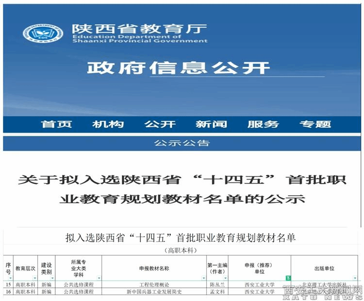 (本網訊)近日,陜西省教育廳公布了陜西省“十四五”首批職業教育規劃教材的立項結果,我校2本教材獲批立項。兩本教材分別是馬克思主義學院“中國式現代化暨強軍倫理高水平學科團隊”陳叢蘭教授負責的《工程倫理概論》和孟文科副教授負責的《新中國兵器工業發展簡史》。