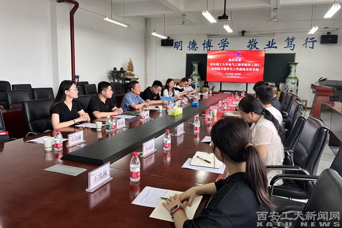 (本網訊)為深入學習貫徹習近平新時代中國特色社會主義思想,進一步提升學生思想政治工作的高質量發展,加強輔導員工作交流,7月10日,西安理工大學電氣工程學院來我校電子信息工程學院開展學生工作交流會。西安理工電氣工程學院黨委副書記、副院長何海生,我校電子信息工程學院黨委副書記王利軍出席會議并講話。