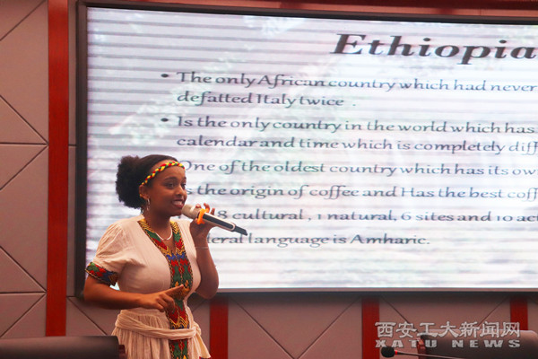 國際處回顧了2019年國際文化節(jié)期間取得的各項(xiàng)成果并播放文化節(jié)視頻集錦,隨后烏干達(dá)留學(xué)生代表亞瑟及埃塞俄比亞留學(xué)生代表貝莉?yàn)榇蠹易隽司实膰业乩?、文化美食等“一帶一路”國家概況展示。我校光電學(xué)院學(xué)生用英文介紹了自己的家鄉(xiāng)---南京,中外學(xué)生置身其中,享受別樣異域風(fēng)情。