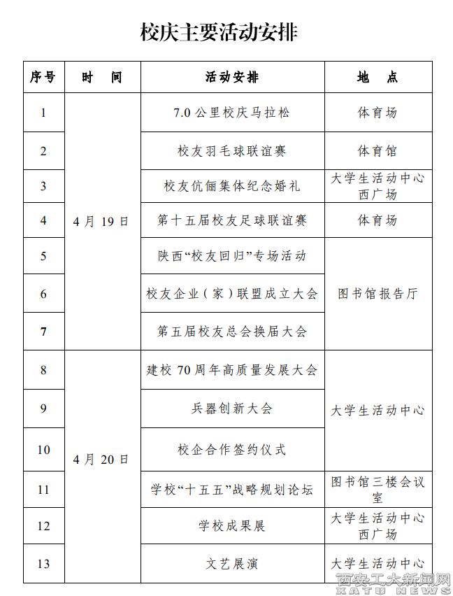 70周年校慶,是海內(nèi)外全體西工人共同慶賀母校生日的一次盛會(huì),更是西安工業(yè)大學(xué)站在新的歷史起點(diǎn)上賡續(xù)兵工精神、繼往開未來(lái),開啟加快建設(shè)特色鮮明、影響廣泛的國(guó)內(nèi)一流高水平大學(xué)新征程的重要里程碑。校慶日前后,學(xué)校圍繞兵工校慶和校友校慶兩大主線,舉辦建校70周年高質(zhì)量發(fā)展大會(huì)、兵器創(chuàng)新大會(huì)、校企合作簽約儀式、陜西“校友回歸”專場(chǎng)活動(dòng)、學(xué)校 “十五五”戰(zhàn)略規(guī)劃論壇、學(xué)校成果展、校友伉儷集體紀(jì)念婚禮、文藝展演等校慶獻(xiàn)禮系列活動(dòng)。4月20日,學(xué)校將通過官方視頻號(hào)、抖音號(hào)等平臺(tái)直播建校70周年高質(zhì)量發(fā)展大會(huì)盛況。
