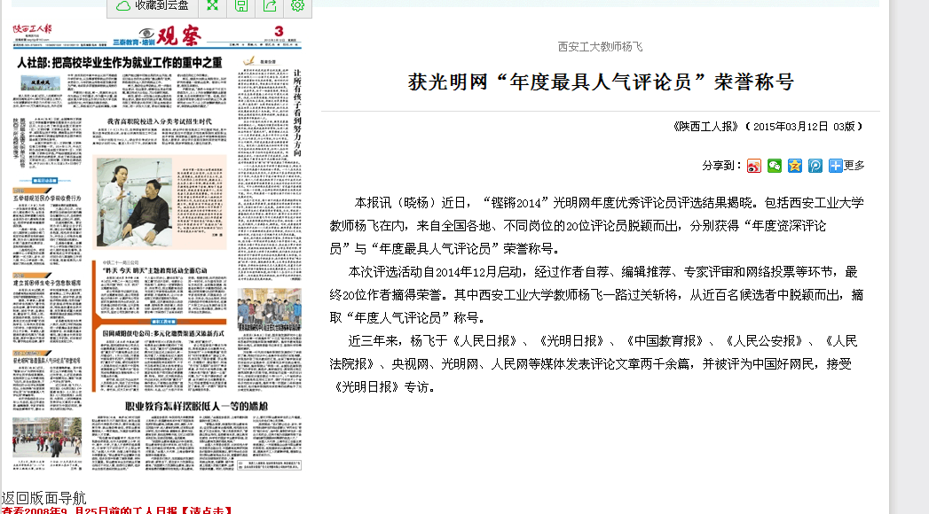 近三年來,楊飛于《人民日報》、《光明日報》、《中國教育報》、《人民公安報》、《人民法院報》、央視網、光明網、人民網等媒體發表評論文章兩千余篇,并被評為中國好網民,接受《光明日報》專訪。(20150312《陜西工人報》)