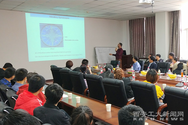 會上,Prof. Dr. NajibKacem提出了諧振微陀螺儀的設(shè)計(jì)和實(shí)現(xiàn)方法。值得注意的是,研究表明諧振微陀螺儀達(dá)到最佳靈敏度,其感應(yīng)頻率比激勵頻率高四倍,這一理念給在座師生帶來了科研上的新角度和新啟發(fā)。