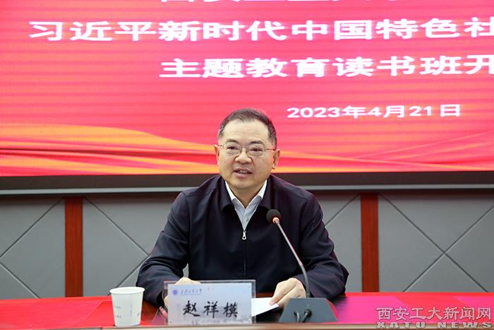 (本網(wǎng)訊)根據(jù)學(xué)校主題教育實施方案安排,學(xué)校學(xué)習(xí)貫徹習(xí)近平新時代中國特色社會主義思想主題教育讀書班4月21日在未央校區(qū)學(xué)術(shù)報告廳開班。校長、黨委副書記、學(xué)校主題教育領(lǐng)導(dǎo)小組副組長趙祥模作動員講話。校黨委副書記、紀(jì)委書記、監(jiān)察專員王發(fā)合主持開班式。