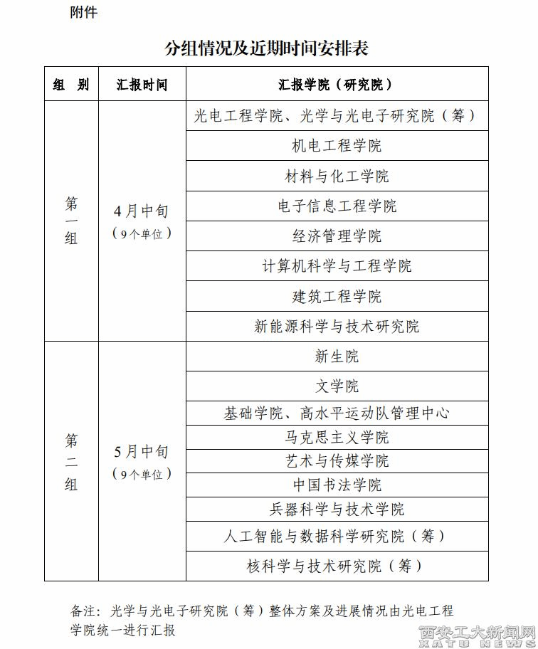 各學院(研究院)每兩個月匯報1次,分為兩組交替進行匯報,全校18個學院(研究院)具體分組見附件。