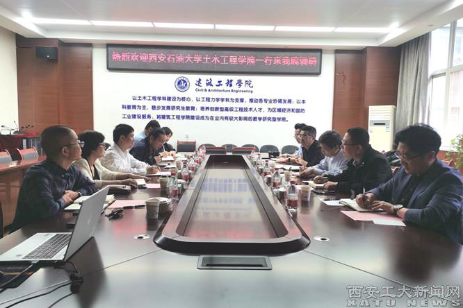 會上,劉慧萍和陳濤分別介紹了雙方參會人員,楊戰社對西安石油大學的情況進行了介紹,李俊亭向參會人員介紹了西安石油大學土木工程學院的情況,黃華介紹了西安工業大學和建筑工程學院的基本情況。雙方在學院專業設置、培養特色、專業認證、實驗室建設、國際留學生教育、師資引進和教師聘期考核等多個方面進行了深入交流。