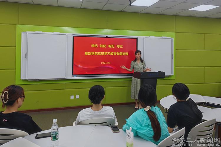 (本網訊)6月19日,基礎學院黨委書記張英給學生黨員作《學紀、知紀、明紀、守紀》黨紀學習教育專題黨課。